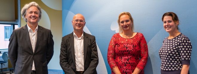 Van links naar rechts: Jos van Kessel - voorzitter College van Bestuur van het Koning Willem I College/ Jeroen Ankersmit - gemandateerd bestuurder van HBO Academy en directievoorzitter bij MBO College Hilversum (ROC van Amsterdam - Flevoland)/ Jessica van den Bosch - directievoorzitter HBO Academie/ Mariel Feijen – transitieversterker Koning Willem I College.